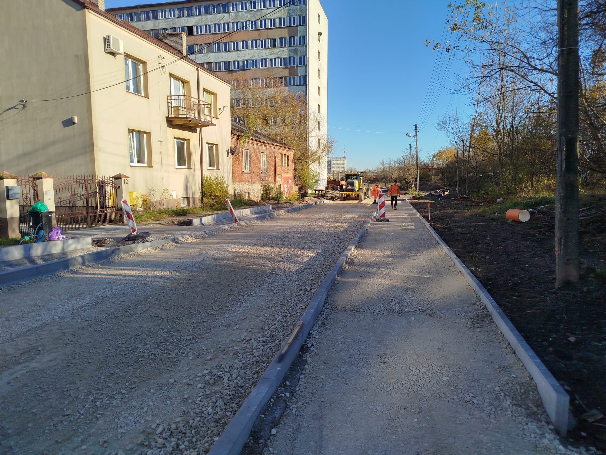 Przeprowadzono roboty z branży wodociągowej oraz kanalizacji deszczowej po stronie północnej, warstwy konstrukcyjne jezdni (poza warstwą ścieralną) od początku przebudowywanego odcinka do posesji nr 40. Trwają prace przy budowie kanału technologicznego i oświetlenia. W najbliższym czasie zaplanowane jest rozpoczęcie robót brukarskich na chodniku i zjazdach.